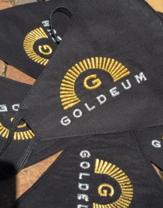 Céglogóval gépi hímzéssel készült arcmaszk, szájmaszk. 100 % fekete pamut anyagból készült. A hímzés arany és ezüst fémszállal.